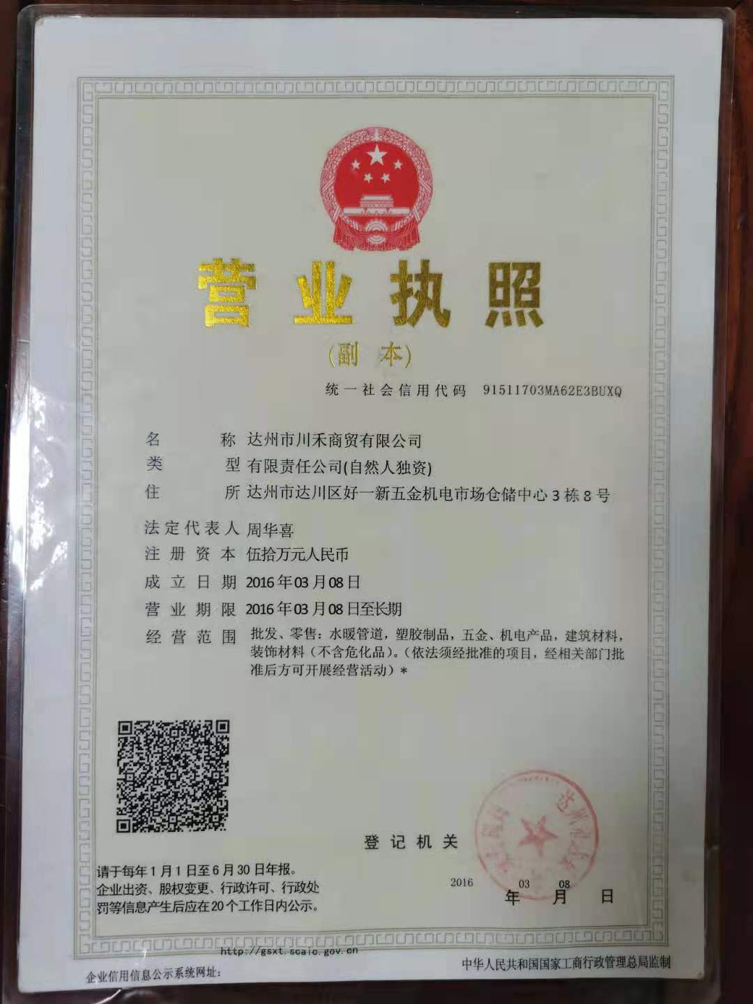 達(dá)州市川禾商貿(mào)有限公司是一家專業(yè)從事銷售各種型號(hào)規(guī)格的給水、排水、穿線管道等市政工程管道的公司, 聯(lián)塑管道的達(dá)州市正規(guī)代理商.